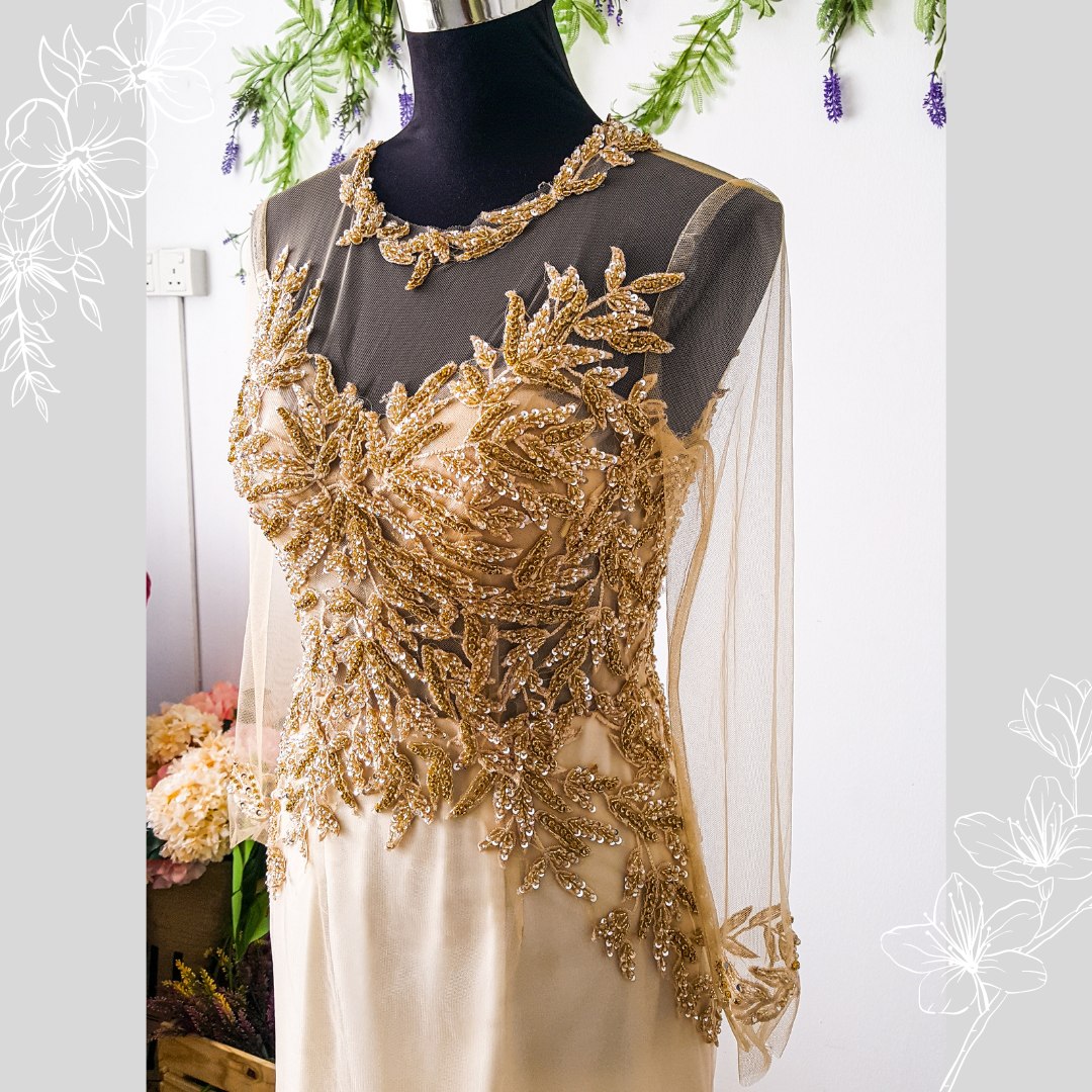 Evening Dress 812LLEL01 Shirley Gold long sleeves sheath gold leaves a Plus size Event Reception Dinner Dress rental Malaysia Pengantin Kahwin