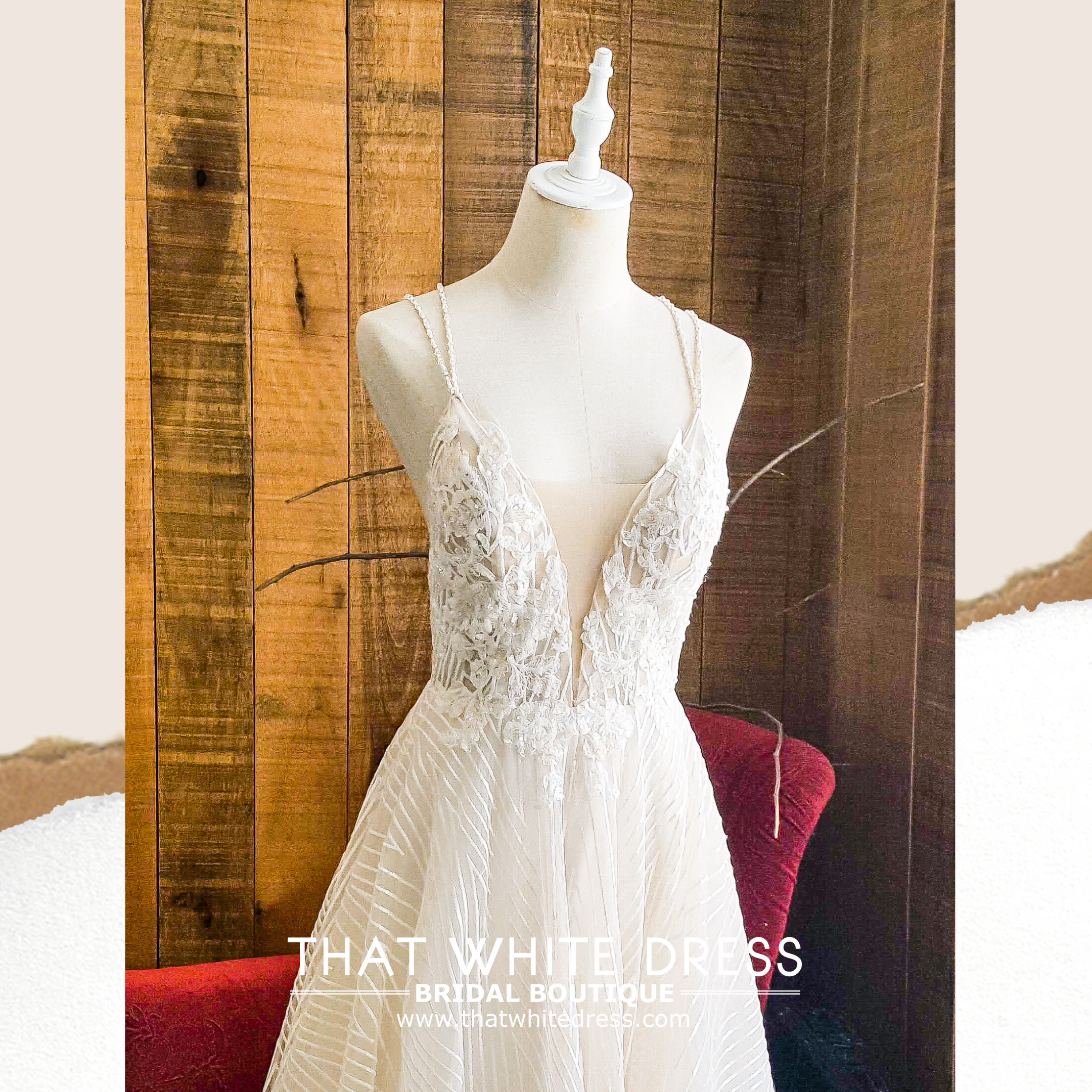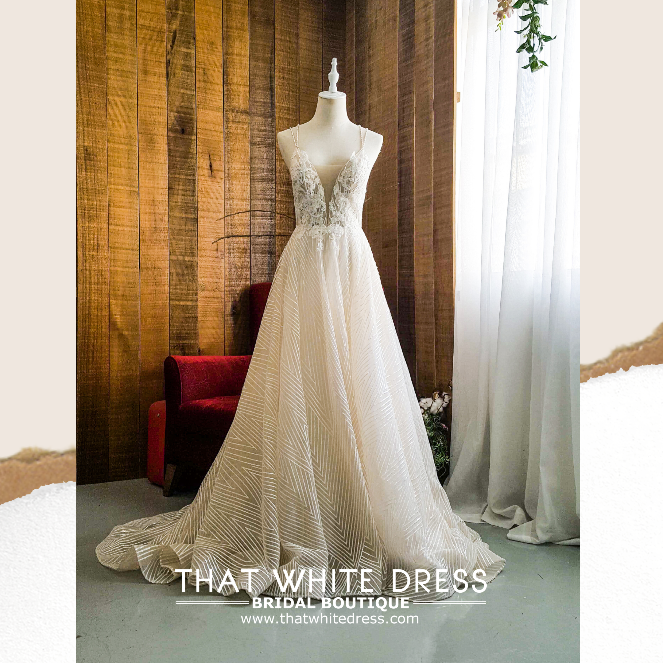 201RYW02 Olivia Champagne Spag Geometry A line f Bridal event wedding dress reception rental custom make