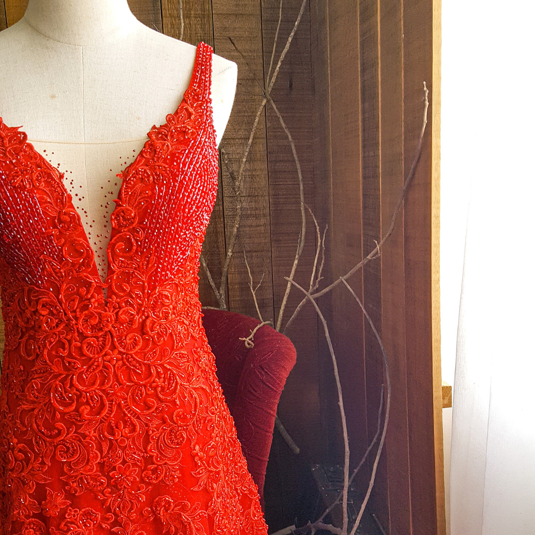 Gorgeous red evening dress in beautiful French floral lace and embellishment.