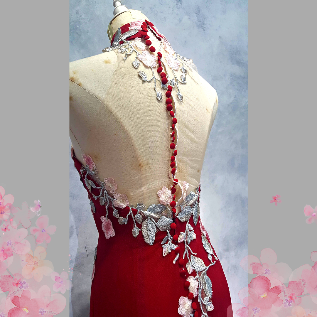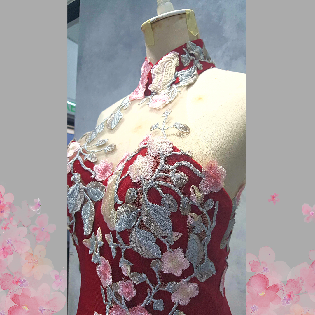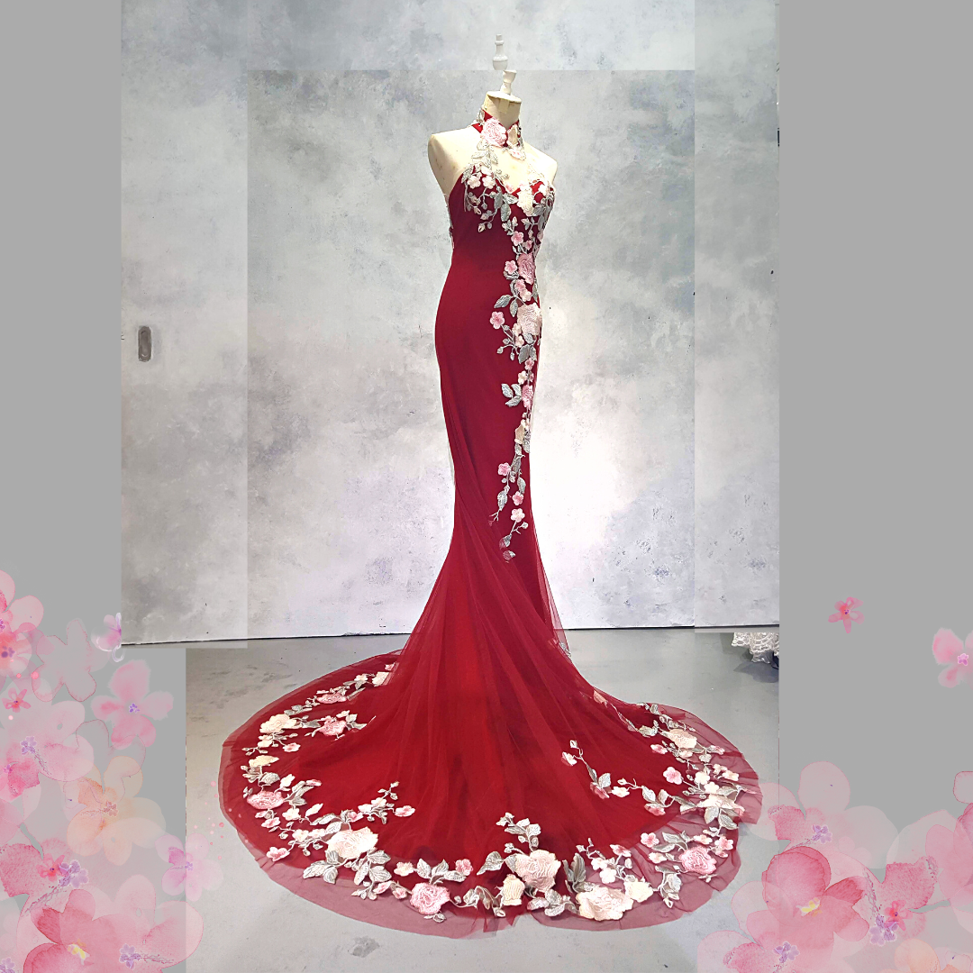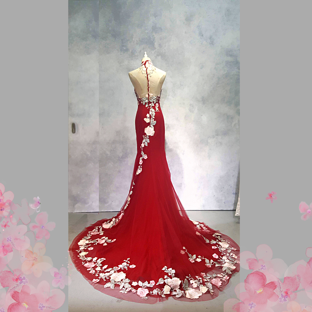 2210EL06E01 Aya Cheongsam Red tulle with Pink Rose (2) Oriental Cheong Sam Qi Pao rental Malaysia Kuala Lumpur Petaling Jaya Evening Dress