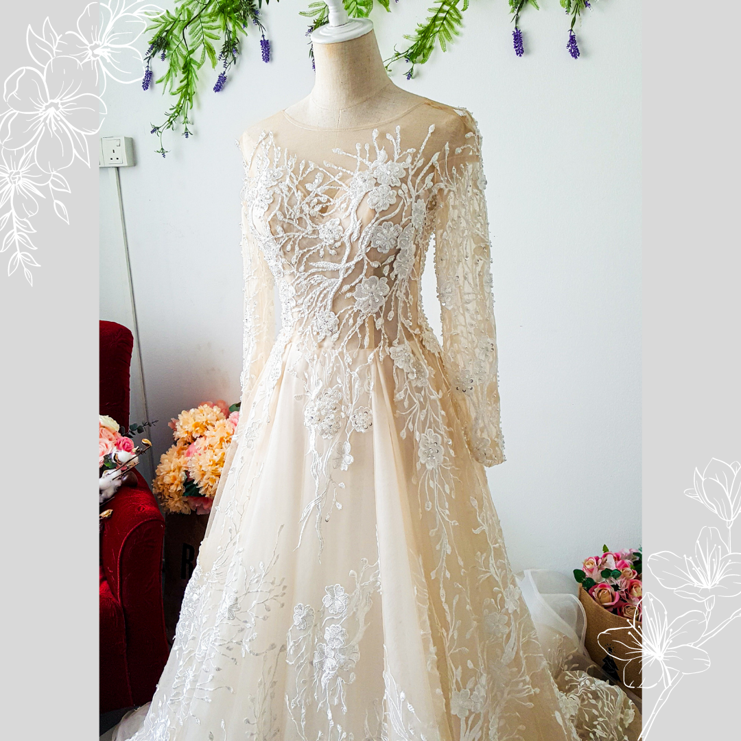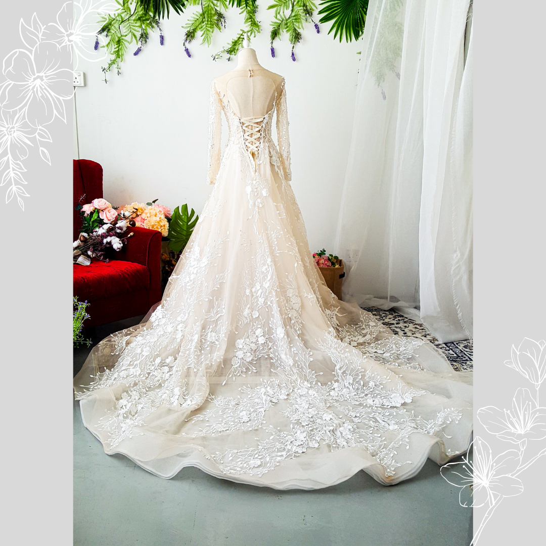 77LLW03 LL Hannah Long Sleeves Illusion Neck off shoulder Princess Champagne wedding dress rental malaysia pengantin sewa kahwin