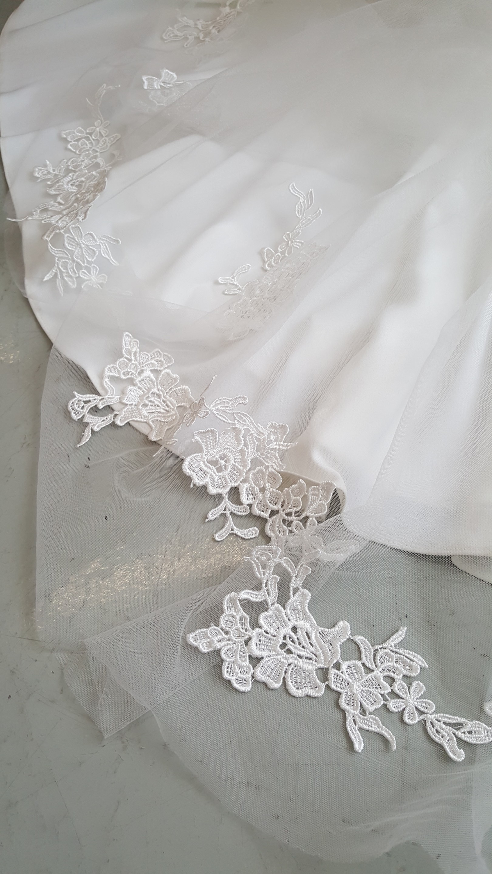 Type of Lace: French Guipure Lace, Lace scattered along the back of the veil, front is clear no lace