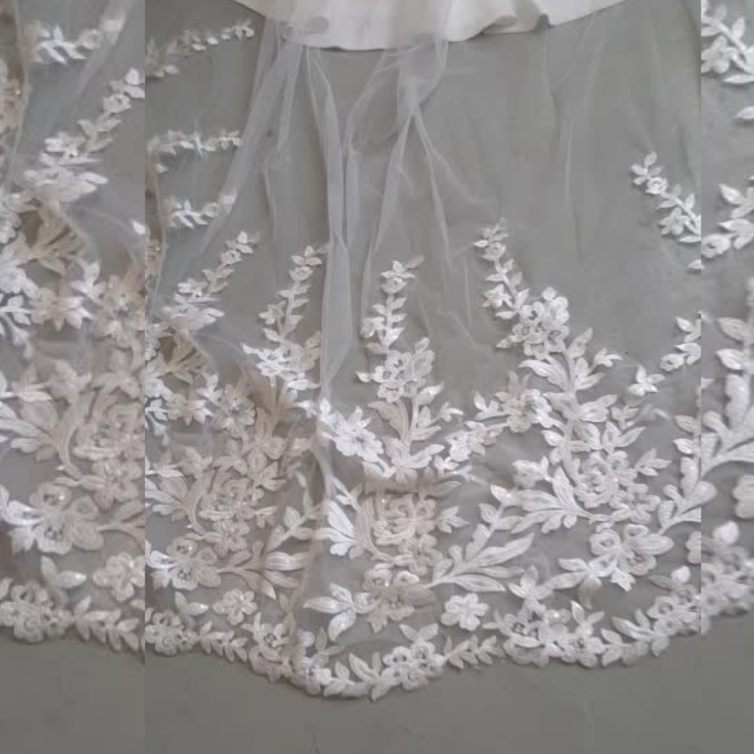 Type of Lace: French Guipure Lace with sparkly sequins, Full Lace along the train of the veil, front is clear