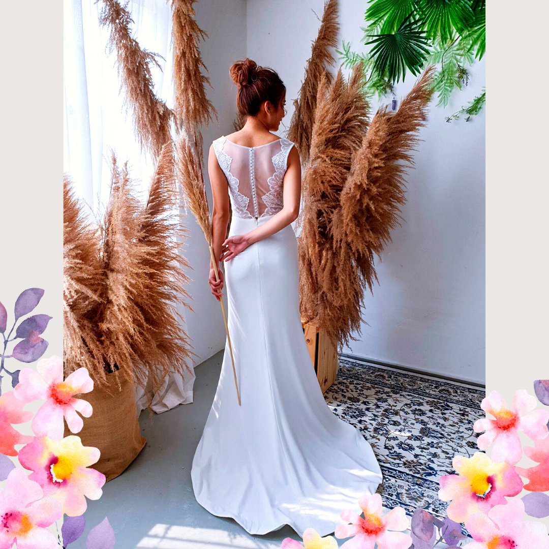 812BY02W04 Varyssa V neck Illusion back satin sheath 1 ROM wedding dress rental Malaysia, Simple wedding dress malaysia, ROM wedding gown Kuala Lumpur, Garden wedding reception Malaysia,