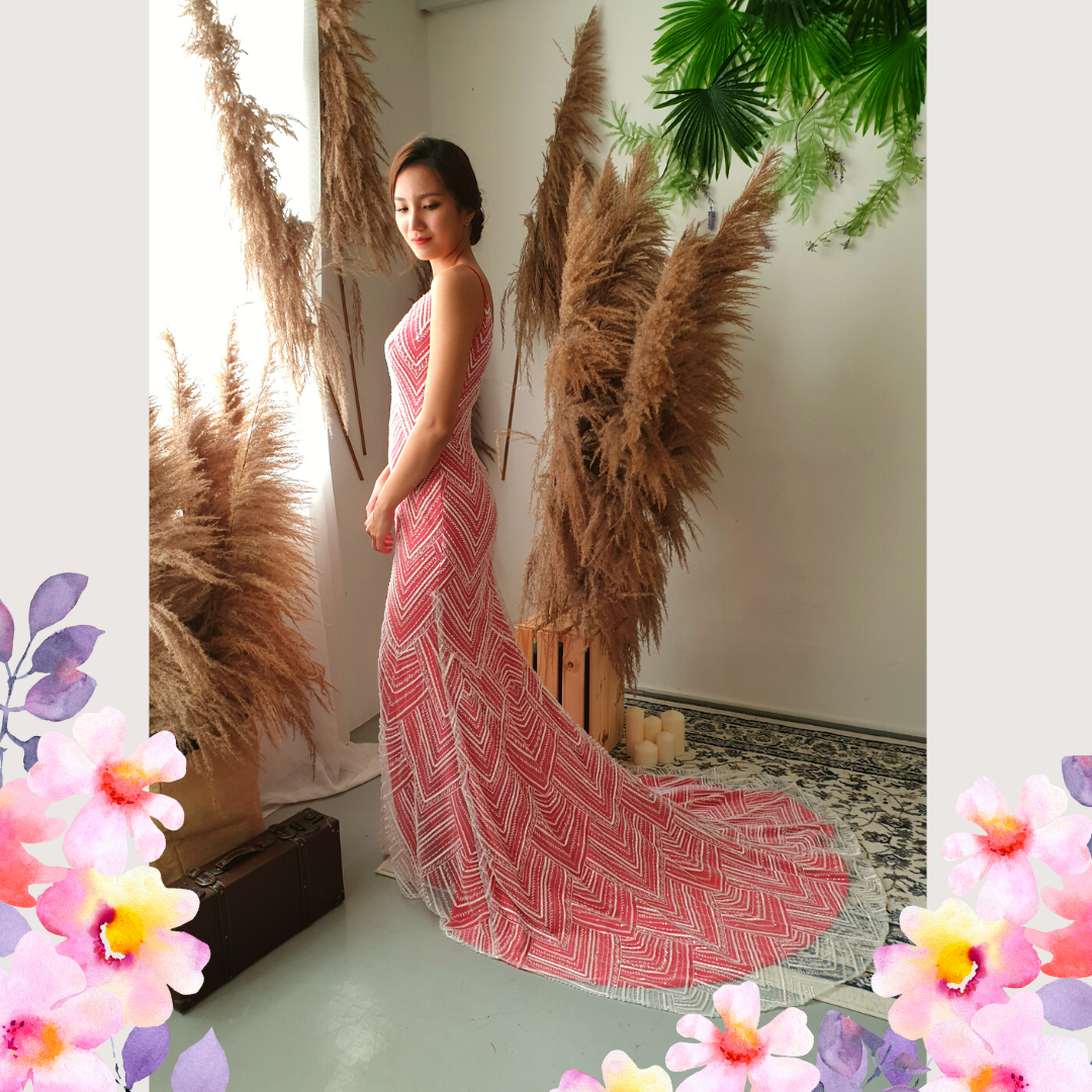Evening Dress 906BY04E01 Jarina Red Spaghetti strap full sequin in white lace 1 Bride Wedding Event Reception Dinner Dress rental Malaysia