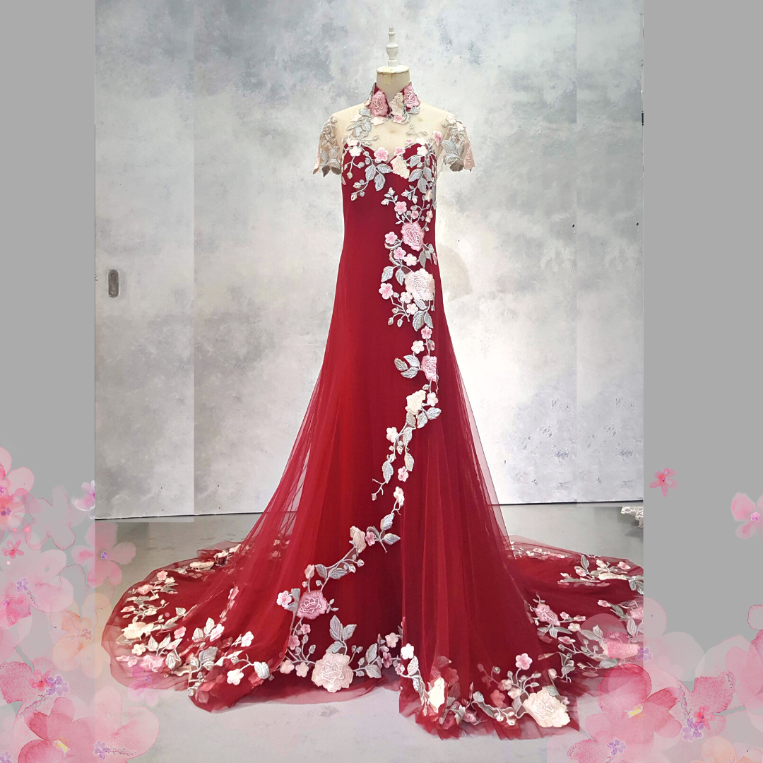 2210EL06EL01 Aida Plus Cheongsam Red tulle with Pink Rose Cap seleeves