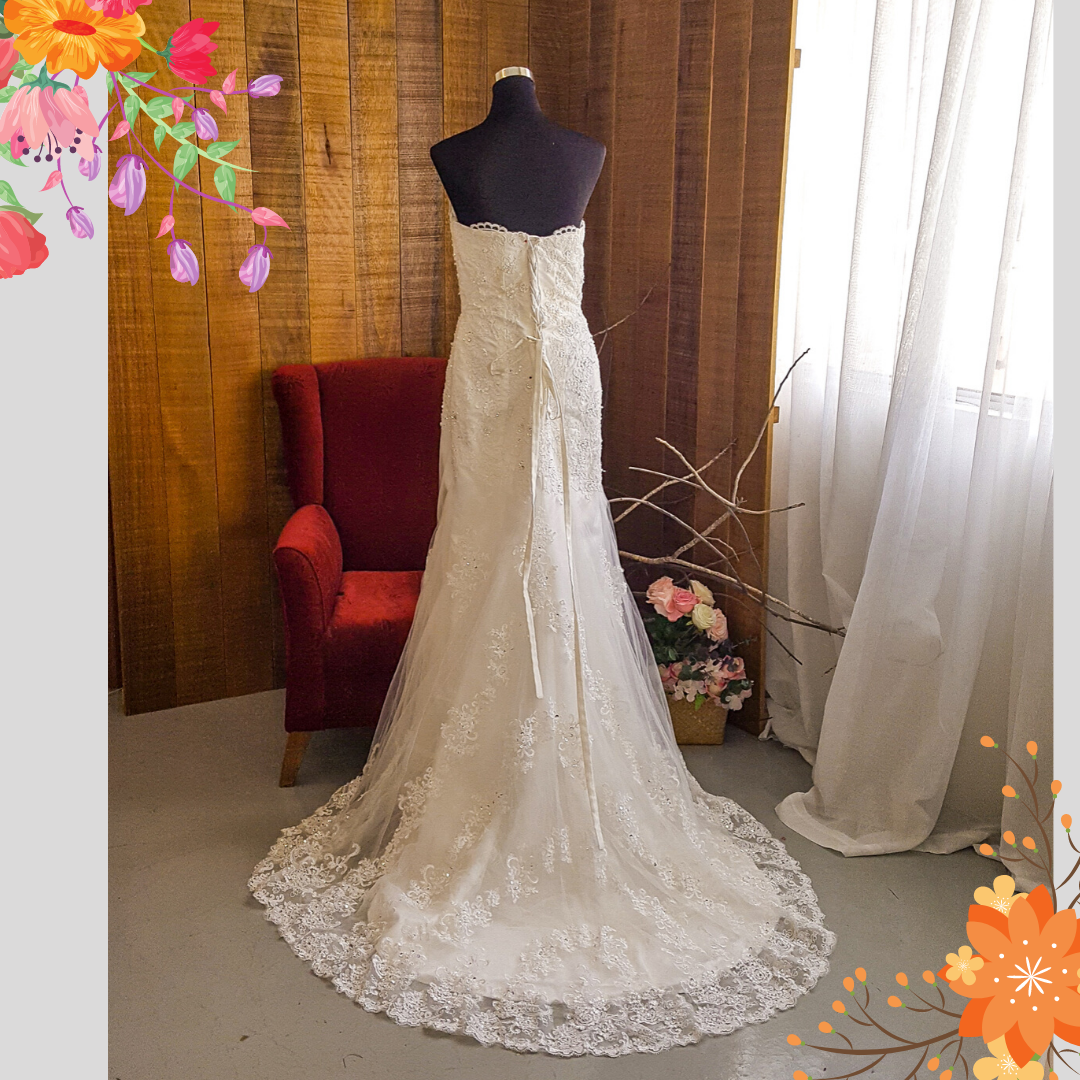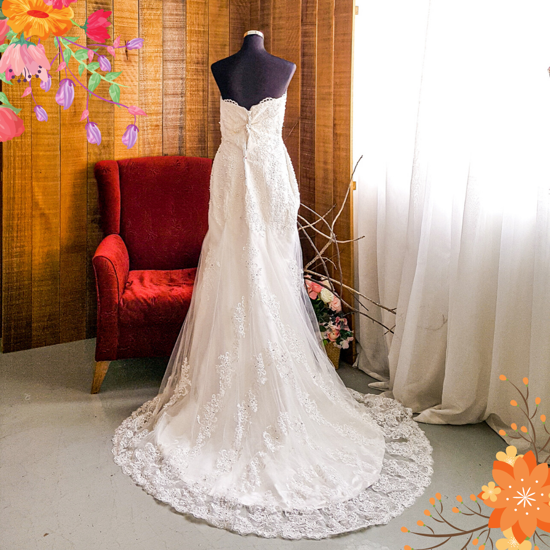 Featuring a beautiful lace embroidery with elegant beading details, this gorgeous wedding dress is both elegant and timeless!