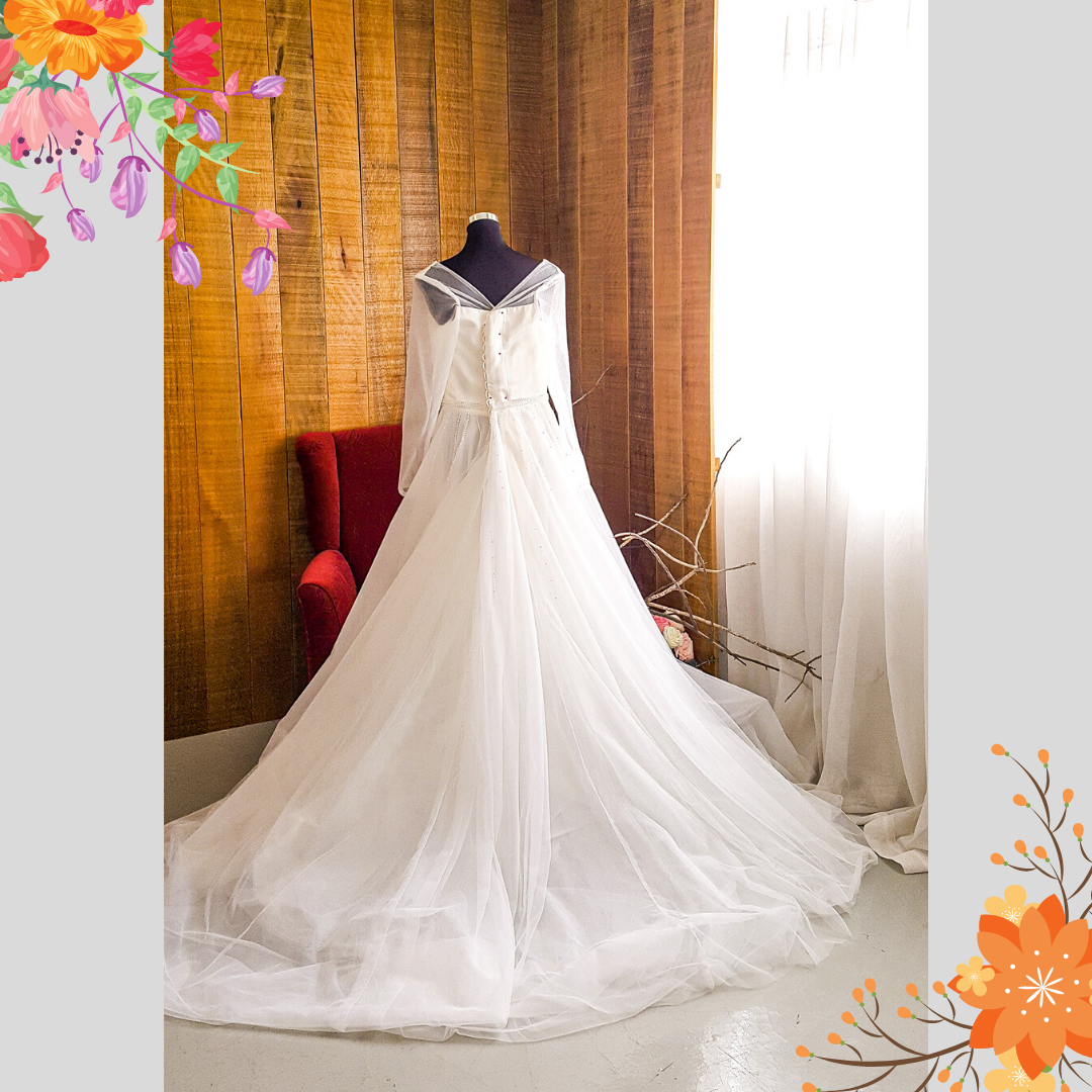 Featuring a beautiful lace embroidery with elegant beading details, this gorgeous wedding dress is both elegant and timeless!