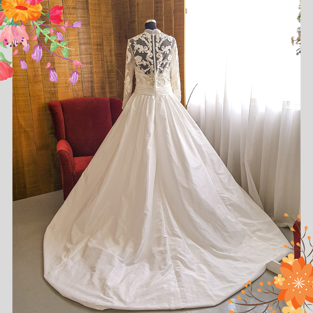 Can be teamed with a detachable long sleeves inner garment to convert it into a conservative covered back dress suitable for church wedding, muslimah wedding/majlis perkahwinan, or nikah.