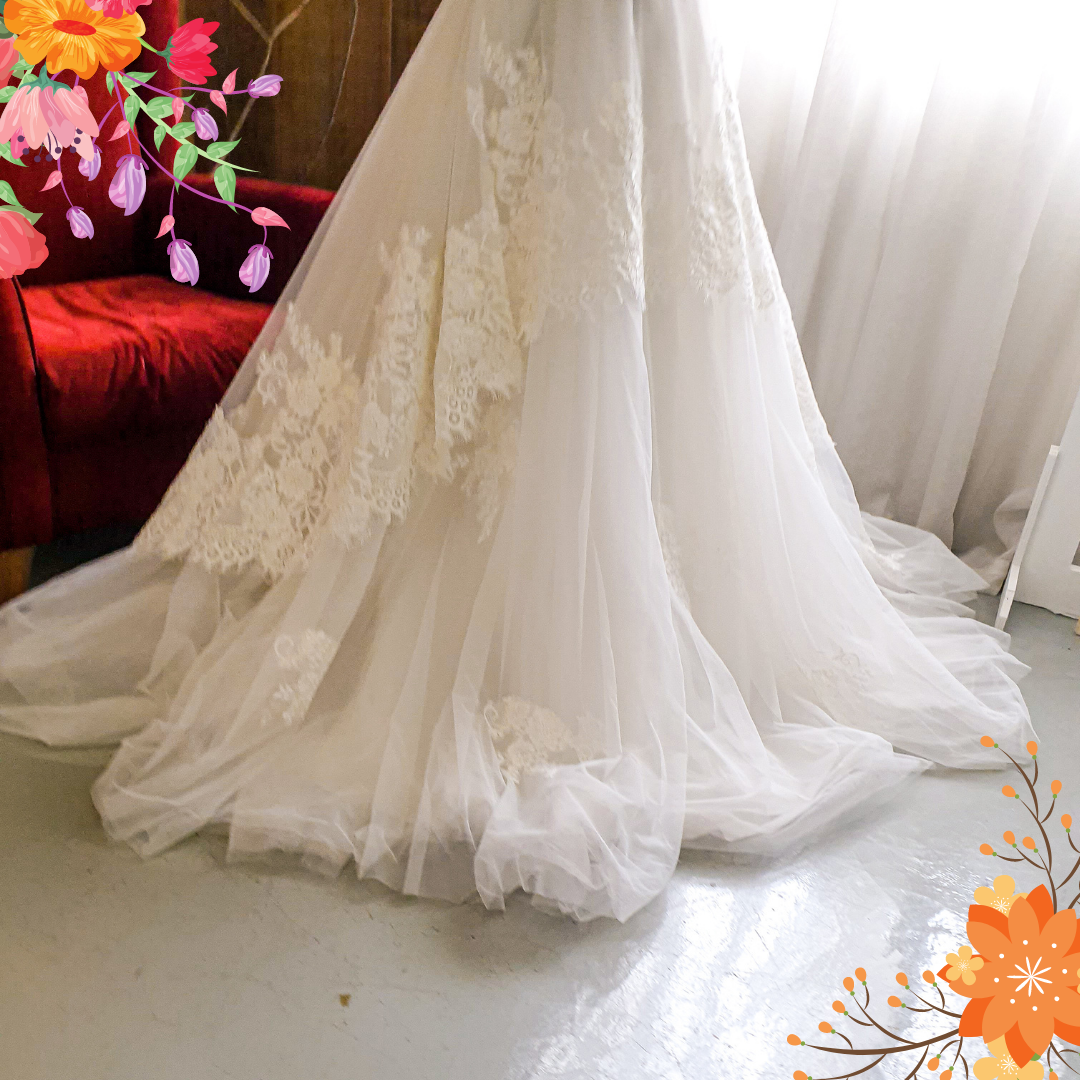 Featuring a beautiful lace embroidery with elegant beading details, this gorgeous wedding dress is both elegant and timeless!