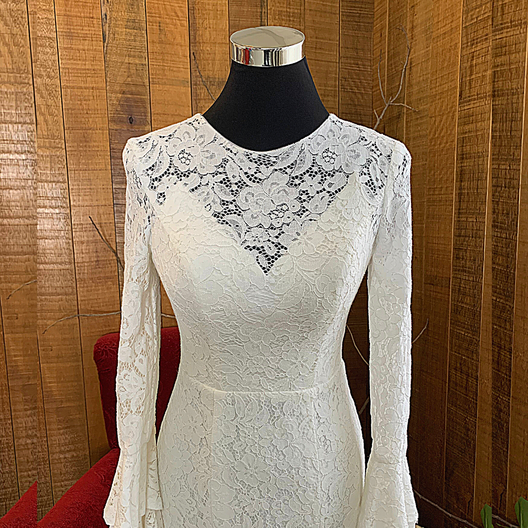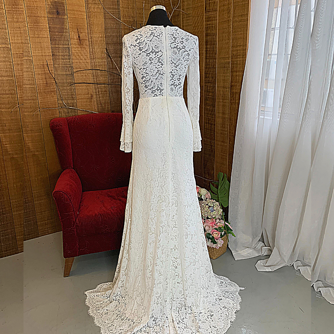 Couture design Long sleeves wedding dress with elegant round neck in Full French Chantilly lace.
