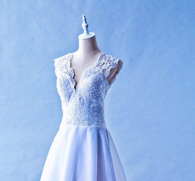 Strap dress with Deep V neck line. Corsetted bodice with a A line flare skirt in classy organza. Button details decorated the chapel train.