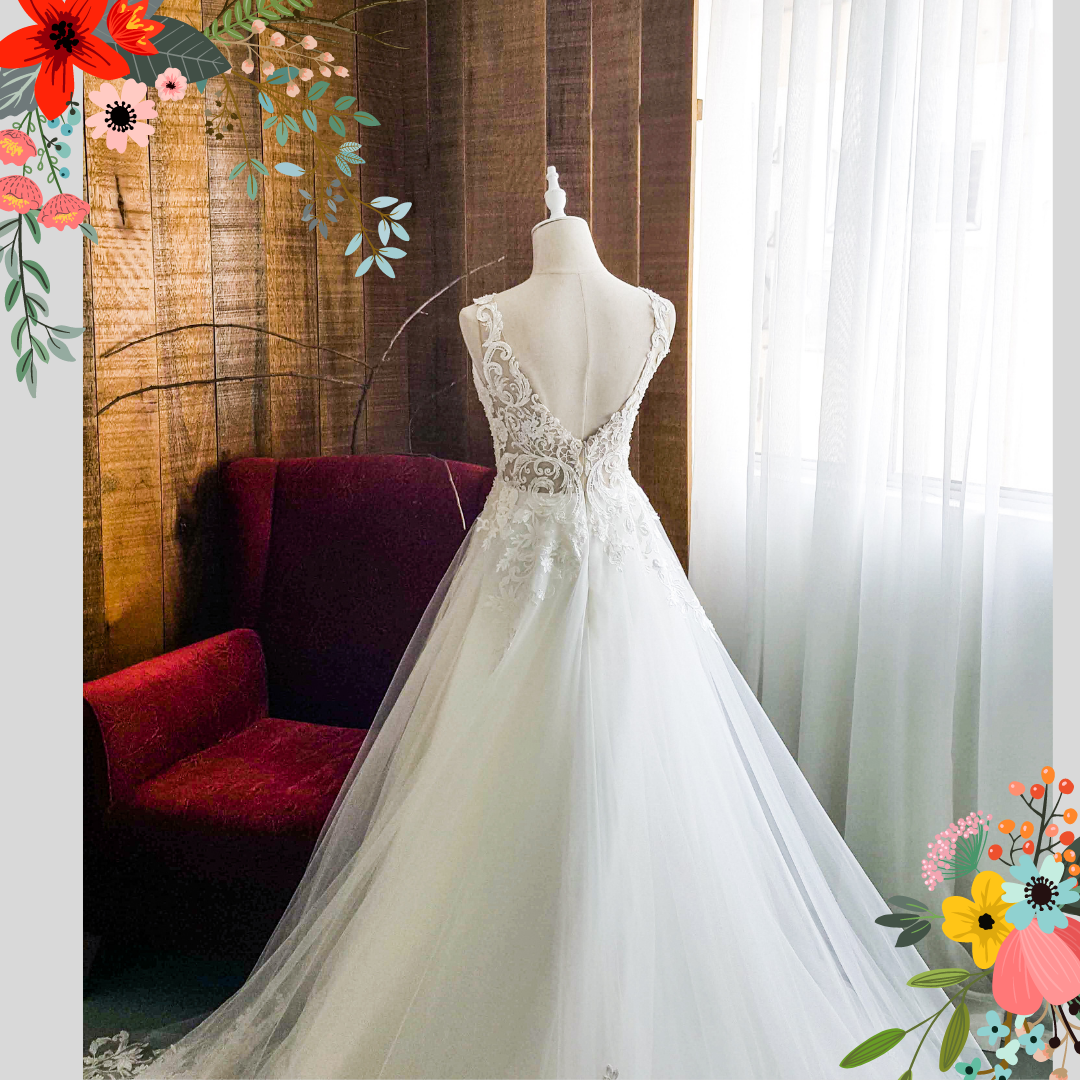 910BY05W02 Barrie Strap V illusion neck A line lace train b Low Back Button Bride Wedding Gown Premium Designer Malaysia rental