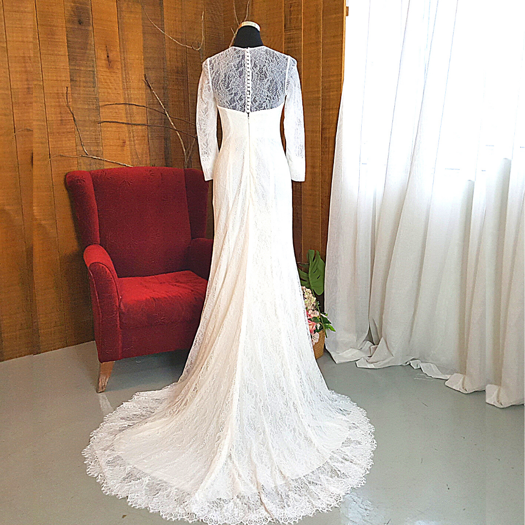 Minimalist French Chantilly Lace couture design in long sleeves design.